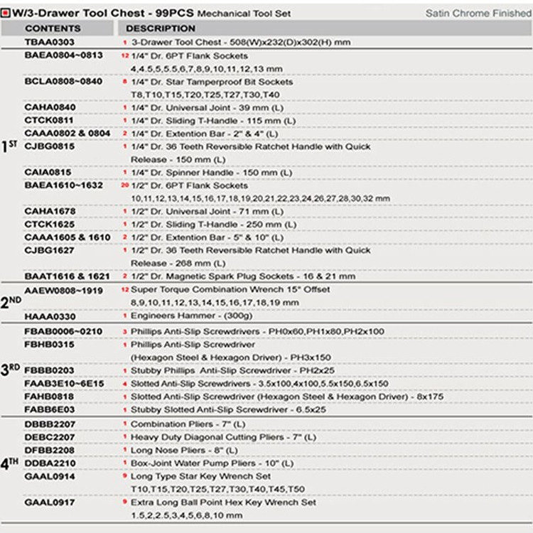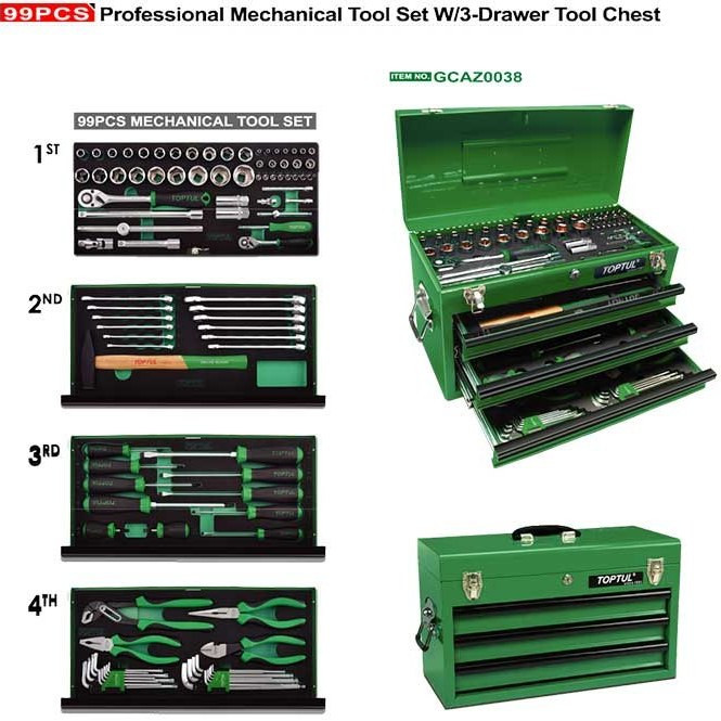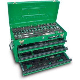 جعبه ابزار آهنی سبز 99 پارچه تاپ تول مدل GCAZ0038 یک مجموعه از ابزارهای دستی و برقی است که برای کارهای مختلف صنعتی، تعمیراتی و خانگی مناسب است. این جعبه ابزار شامل: